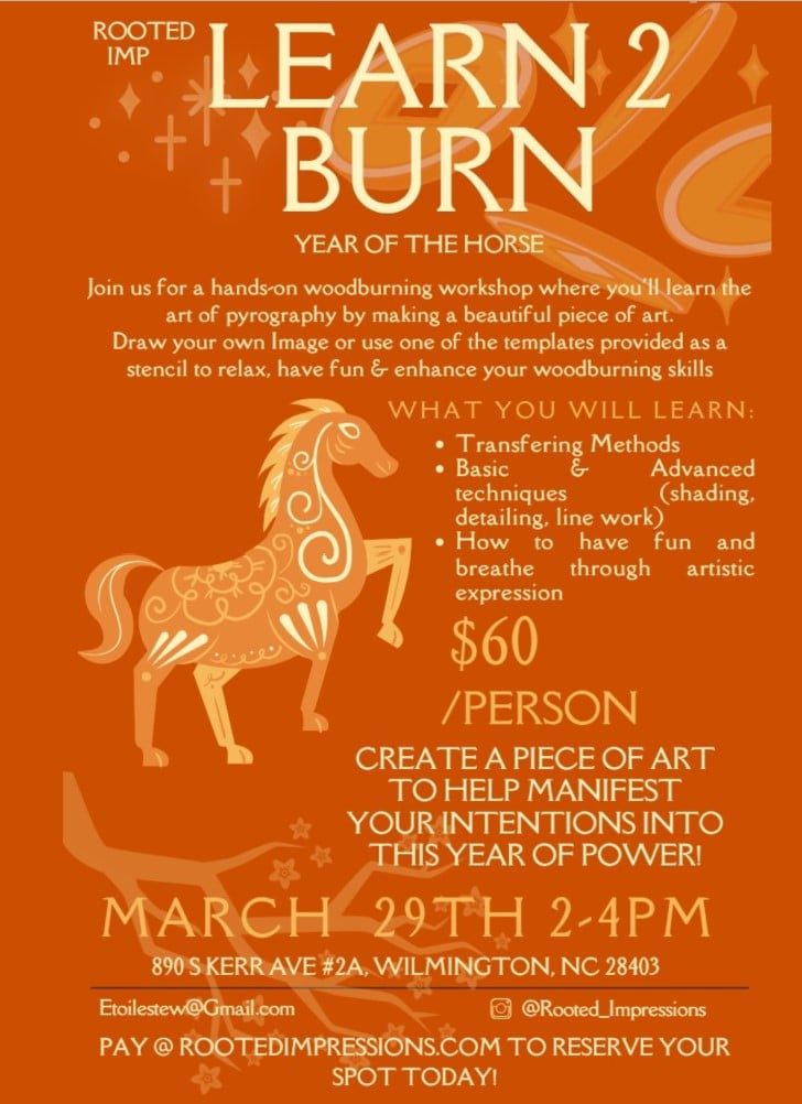 Join us for a hands-on woodburning workshop where you'll learn the art of pyrography by making a beautiful piece of art.
